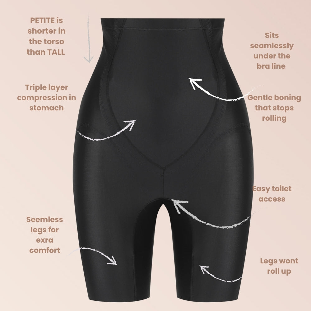 Comfortable, supportive, breathable, creates hour glass figure, the perfect every day comfort wear that smooths and defines you body for your favourite dress or skirt. Designed for the woman under 5"5 in height or for women who like shorter styles.